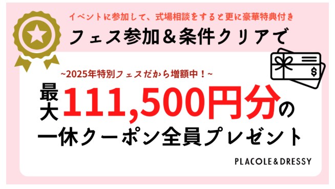 当サイト経由でプラコレに登録、またはDressy Roomを利用。その後に、プラコレウェディングに掲載の式場見学・ブライダルフェア参加、成約で一休.comクーポンが貰えます。