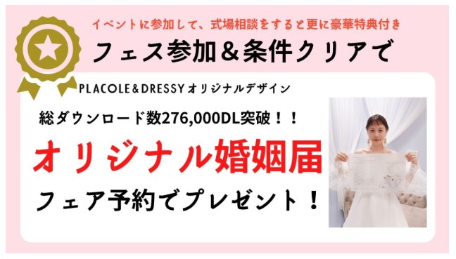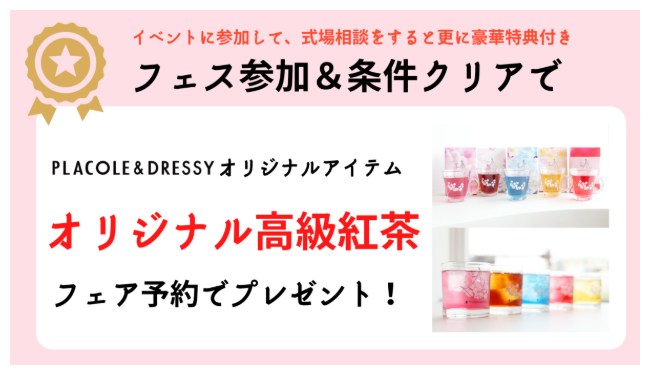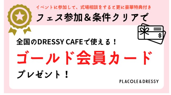 | Dressy Room 利用&式場相談特典 | ・オリジナル婚姻届プレゼント![]() ![]() ・オリジナル高級紅茶プレゼント ![]() ![]() ・全国のDressy Cafeで使えるゴールド会員カードプレゼント (お会計永久10%オフ) ![]() ![]() |