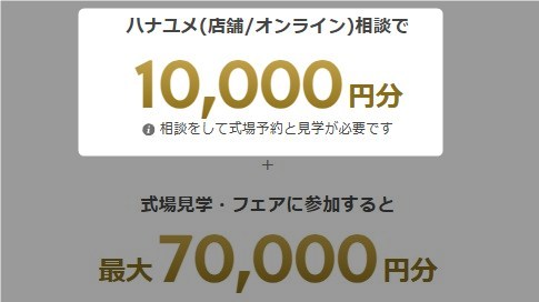 | 3式場見学 (成約不要で貰える) | 70,000円分 |