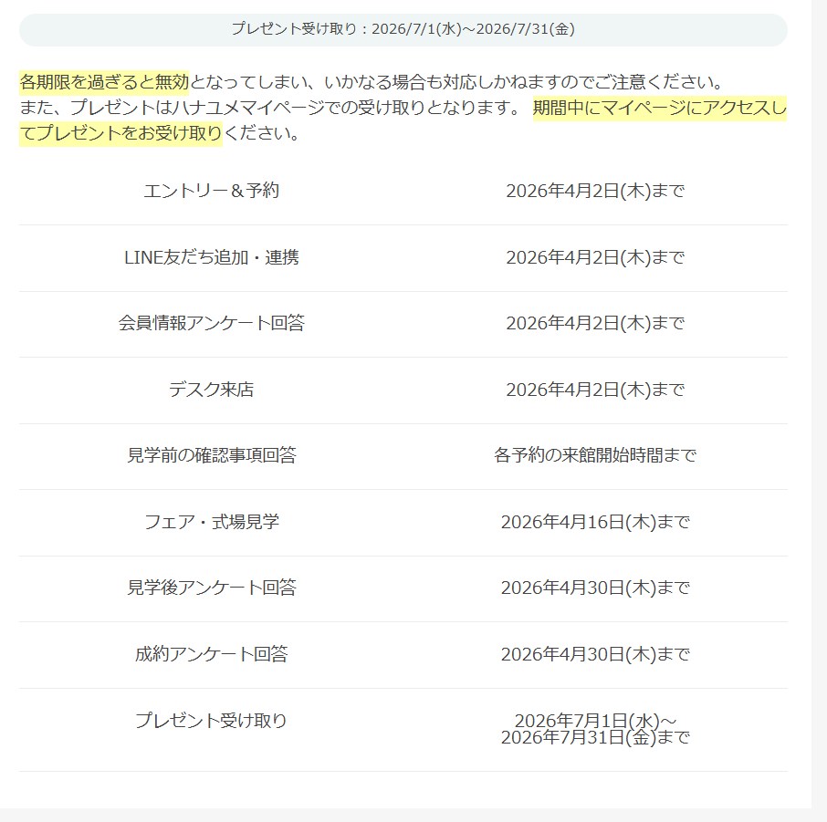 なお、プレゼントはハナユメのマイページ上でのお受け取りとなります。期間中にマイページへアクセスし、受け取らないとプレゼントが無効になってしまうのでこちらも注意してくださいませ。