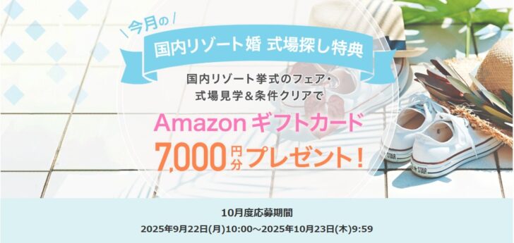 国内リゾート挙式キャンペーン | 10月23日(木) 9:59まで | 国内リゾート挙式のフェア・式場見学&条件クリアでAmazonギフトカード7,000円分プレゼント |
