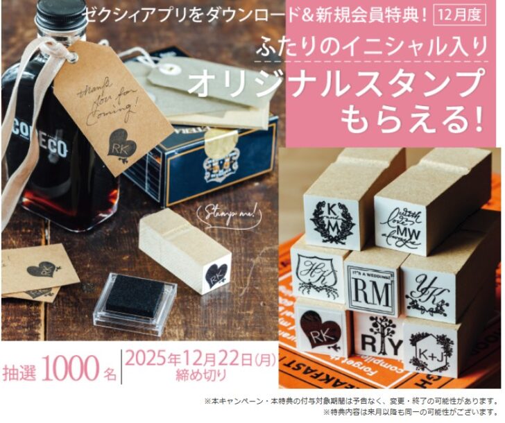 | ゼクシィアプリDLキャンペーン | 12月22日(月)まで | ゼクシィアプリをダウンロード&新規会員登録でふたりのイニシャル入りオリジナルスタンププレゼント(抽選で1,000名様) |