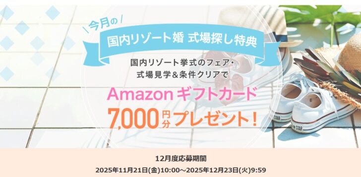 | 国内リゾート挙式キャンペーン | 12月23日(金) 9:59まで | 国内リゾート挙式のフェア・式場見学&条件クリアでAmazonギフトカード7,000円分プレゼント |